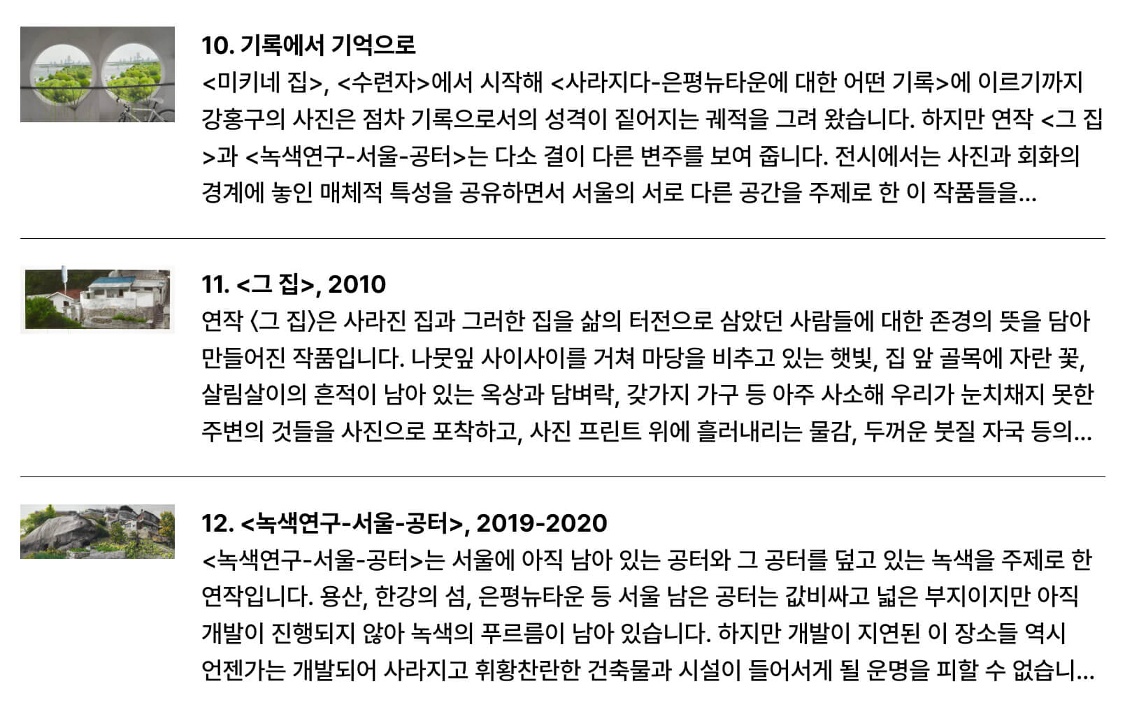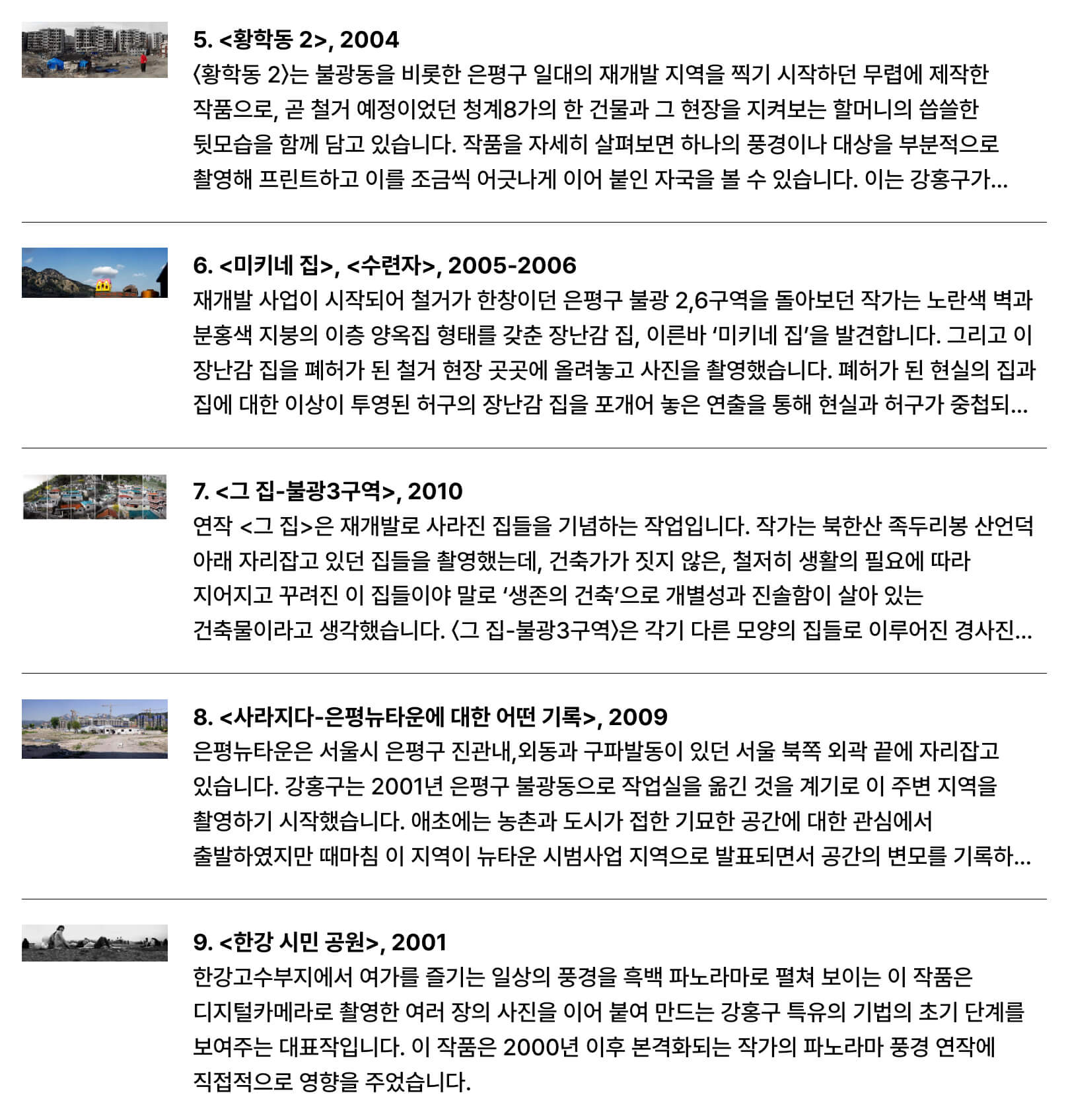 이번 작품에서는 서울시 은평구 불광동과 은평뉴타운 재개발 지역에 대해 자신의 작품으로 해석을 요구하고 있다.