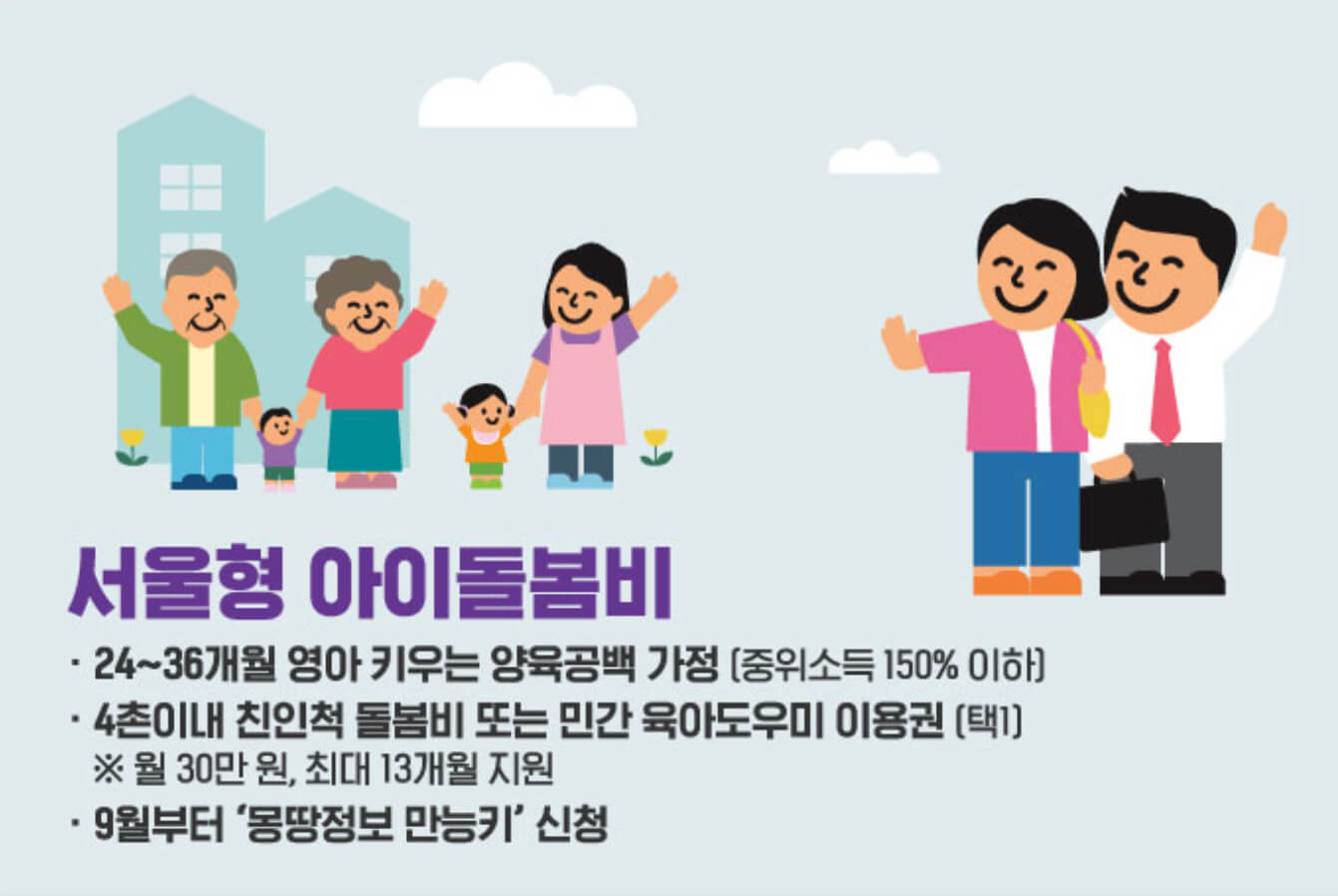 서울 아이돌봄비 매월30만원 13개월 지원 아이돌봄비 지원 사업은 서울시에서 진행되는 육아지원 사업으로 4촌 이내의 친인척이 아이 돌봄의 조력자 역할을 할 경우 매월 30만 원을 13개월간 지원