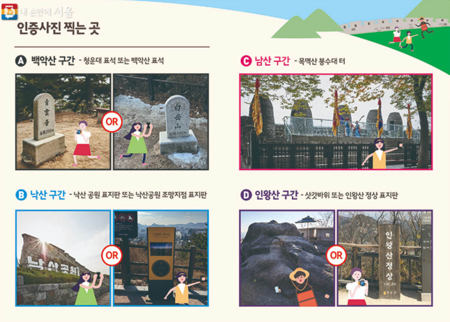 그럼 앞으로 어떻게 바뀌는것일 까요? 앞으로는 한양도성 스탬프 대신 4곳(백악산 구간, 낙산 구간, 남산 구간, 인왕산 구간)에 지정 장소에서 얼굴이 나오도록 👉 인증사진만 찍으면 됩니다.
